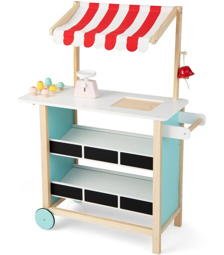 Ouvrez un monde d'imagination avec ce support d'épicerie en bois pour enfants. Ce chariot à crème glacée pour tout-petits est construit avec du bois massif et du MDF haute densité pour assurer une structure solide pour un jeu en toute sécurité. Notre support de marché dispose d'une cloche et d'une balance pour que les enfants puissent jouer au jeu d'épicerie avec du contenu. design pour un meilleur affichage et avec des tableaux noirs pour présenter le produit. Ce chariot à crème glacée pour enfants est soutenu par de solides roues en bois qui permettent aux enfants de vendre leurs jouets. Il aide à améliorer la reconnaissance, la pratique de la communication et bien plus encore. L'auvent avec des rayures élégantes donne au chariot de crème glacée une apparence adorable qui rencontre les yeux des enfants. Il est recommandé pour les enfants de plus de 3 ans. Attributs : 【Chariot à crème glacée pour enfants】comprenant 6 types de choix de crème glacée différents dans ce chariot à crème glacée en bois aux couleurs vives, vos enfants peuvent faire semblant de vendre la crème glacée à leur guise. Et les roues avant avec la poignée latérale permettent vraiment à vos enfants de pousser ou de tirer facilement ce chariot à crème glacée. 【Support de marché d'épicerie pour tout-petits avec étagères】ce chariot à crème glacée sert également de support d'épicerie ou de marché avec 2 étagères pour afficher toutes sortes de jouets alimentaires (non inclus). Vos enfants pourront écrire ou dessiner sur les ardoises pour présenter les plats du jour. 【Explorez le jeu de rôle réaliste】équipé d'une cloche qui sonne et d'une balance supplémentaire, cet ensemble de jeux d'épicerie pour enfants permet à vos enfants de profiter au maximum du jeu de simulation d'entreprise. Il offre une expérience complète du marché pour encourager le jeu de rôle et éclairer l'imagination et la créativité de votre tout-petit. 【Qualité digne de confiance】notre support de marché est fabriqué en bois dur durable et en MDF haute densité pour garantir un compagnon stable et durable. Nous sommes absolument convaincus que les enfants joueront avec notre épicerie en sachant que cet ensemble de jeux est poli avec une surface lisse et arrondie. 【Excellent cadeau pour les enfants】il est facile pour les parents d'assembler ce chariot à crème glacée avec des instructions détaillées. La couleur vive avec un adorable auvent à rayures rouges attire l'attention des enfants une fois qu'ils ont posé les yeux dessus. Ce chariot à crème glacée est un cadeau gratifiant pour les enfants de plus de 3 ans. La taille finale sera de 79 x 29 x 100 cm (L x l x h). Caractéristiques : Les accessoires riches incluent 6 jouets de crème glacée, 1 balance, 1 cloche Conçu avec des roues roulantes pour un chariot de crème glacée réaliste Comporte des étagères de marketing avec des tableaux noirs pour afficher les jouets alimentaires (non inclus) Améliorer l'imagination, pratiquer l'expérience de la vie réelle, encourager les... ...