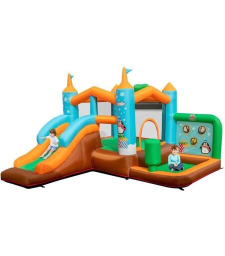 Les couleurs vives et les pingouins mignons Gonfleur recommandé 480 W (non inclus) Toboggan lisse, La zone de saut, la colonne de boxe et le panier de basketball et piscine à balles, Le jeu de lancer avec des scores Accueillir 3 enfants de 3 à 12 ans Fixez le château gonflable au sol avec des piquets Dimensions 335 x 300 x 200 cm Limite de poids Max de la partie gonflable 90 kg ...