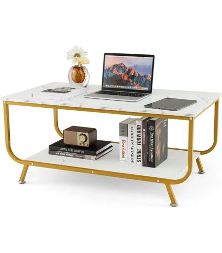Costway - Table Basse Salon Double Plateau Effet Marbre, Table Salon Rectangulaire Moderne, Cadre en Métal, 105 x 55 x 46,5 cm (Blanc doré)