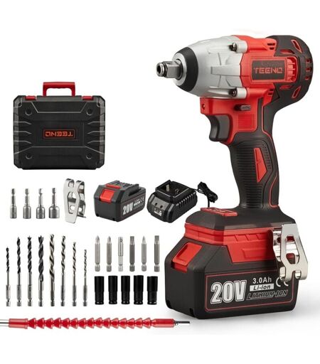 Clé à chocs sans fil Brushless Teeno 320Nm Boulonneuse a Choc avec 3.0Ah Batterie 20V, Boulons de Roue, Boîte avc 25pcs Accessoires (Une batterie)
