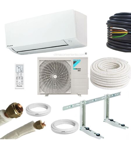 Description générale Climatiseur prêt à poser Daikin 3500W FTXB RXB35C, comprenant un kit de pose de 5 mètres et un support mural. Ce modèle réversible est idéal pour le refroidissement et le chauffage de votre intérieur, offrant une solution efficace et pratique pour le confort de votre maison. Spécifications techniques Capacité de refroidissement : 3,3 kW (1,3 - 3,8 kW) Capacité de chauffage : 3,5 kW (1,3 - 4,8 kW) Consommation en refroidissement : 1,03 kW Consommation en chauffage : 0,94 kW Efficacité énergétique (EER) : 3,21 Efficacité saisonnière (SEER) : 6,05 Coefficient de performance (COP) : 3,8 Plage de fonctionnement en refroidissement : -10 à 46 °C Plage de fonctionnement en chauffage : -15 à 18 °C Étiquette énergétique : A+/A+ Dimensions unité intérieure : 283 x 770 x 216 mm Poids unité intérieure : 8 kg Dimensions unité extérieure : 550 x 658 x 275 mm Poids unité extérieure : 30 kg Compatibilité et accessoires Kit de pose de 5 mètres (raccord, câble, tuyau de condensat) ...