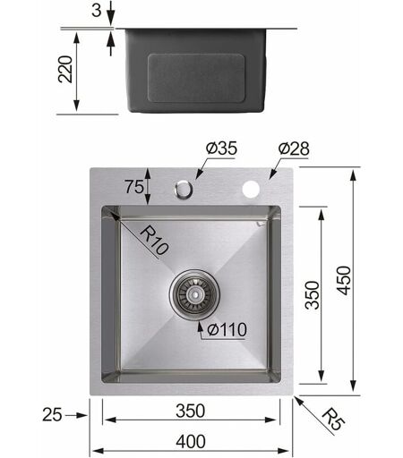 Cecipa - Evier Cuisine 1 Bac 40 x 45 x 22 cm - Évier en Acier Inox 3mm Épais pour Meuble de 40 cm min - Pose à fleur de plan ou à encastrer, avec