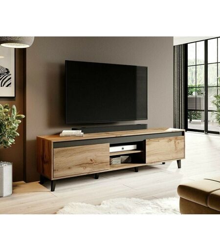 Le meuble TV NORDIS attire l'attention avec ses pieds inhabituels - des patins qui entourent le meuble et représentent une décoration originale dans une couleur anthracite contrastante, qui s'harmonise en même temps très bien avec la couleur agréable, chaude mais aussi intense du corps et des façades . Matériel: Corps (dessus, côtés) et façade :p Anneaux de particules de mélaminé mat 16 mm Latte : panneau de particules stratifié mat de 16 mm Pieds : plastique Dimensions: Largeur : 170 cm Hauteur : 49cm Profondeur : 38cm Couleur : Chêne Wotan + anthracite Support client et SAV en Français - Pas de livraison dans le DOM TOM et la Corse. **Attention la livraison est prévue au pied de l'immeuble ou de la maison et non à domicile. (Dont 5,20 € d'éco-participation) ...