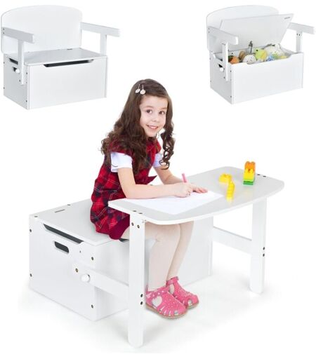 Costway - 3 en 1 Table Enfant en Bois avec Chaise, Banc Coffre à Jouets avec Couvercle & Poignée Découpée, Table d'Activités Convertible pour