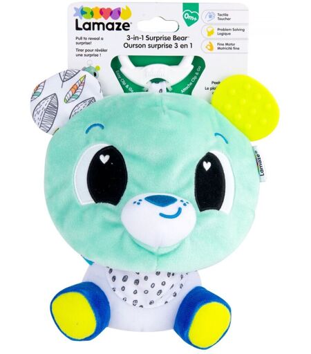 Lamaze - Ourson surprise 3-en-1 - Cet ourson en peluche est plein de surprises ! Pour commencer, c’est un adorable ours en peluche avec un gros visage rond. Mais, tirez sur ses jambes et, vous n’en croirez pas vos yeux ! Un petit ours se cache en dessous ! Et dans sa poche, attaché pour ne pas le perdre, savez-vous ce qu’il y a ? Un autre ours, encore plus petit. Les couleurs vives ravissent les yeux, les textures uniques enchantent les doigts, et l'oreille jaune de l'ourson est parfaite pour se faire les dents ! Les petits ne pourront pas s’en passer. Dès la naissanceTrois ours amusants : les bébés adorent découvrir les ours gigognes cachés dans le grand ours lorsque l’on tire sur le corps de l'ourson.Clip & Go : Le jouet de voyage idéal. Il se fixe facilement à la poussette ou au porte-bébé.Jouet favorisant le développement : Conçu pour éveiller les sens grâce à des couleurs vives et des textures uniques.Parfait pour les dents aussi : Les bébés explorent aussi bien avec la bouche qu’avec les mains, et l'oreille jaune de dentition est parfaite pour se faire les dents.Lamaze : c’est l’heure de jouer ! Il n’y a pas de meilleur moyen de témoigner votre amour, de créer des liens avec votre enfant et de l’aider à se sentir en sécurité. - Dès la Naissance ...