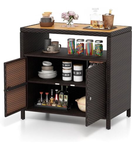 Costway - Armoire de Rangement Exterieur en Rotin, Armoire de Jardin avec Plateau en Bois d'Acacia Compartiment Ouvert Buffet à 2 Portes,
