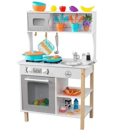 Les points forts Comprend 38 accessoires Les portes du four et du micro-ondes s'ouvrent et se ferment Les boutons du four se tournent facilement Étagères et crochets de suspension pour les casseroles et accessoires Évier amovible, facile à nettoyer Structure en bois élégante et robuste Fournie avec des instructions d'assemblage détaillées, étape par étape ...