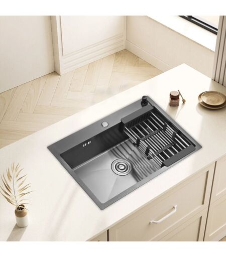 Teeno - vier de Cuisine 1 Bac en Acier Inoxydable 68x45 cm avec Distributeur de Savon et Panier Télescopique, Noir