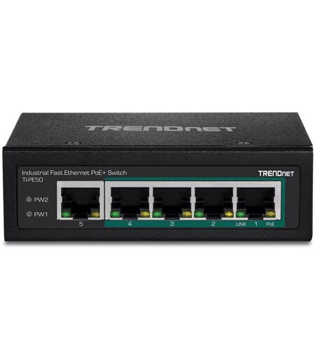 TRENDnet TI-PE50 - Commutateur - non géré - 4 x 10/100 (PoE+) + 1 x 10/100 - Montage sur rail DIN, fixation murale - PoE+ (90 W) - Tension CC - Conformité TAA