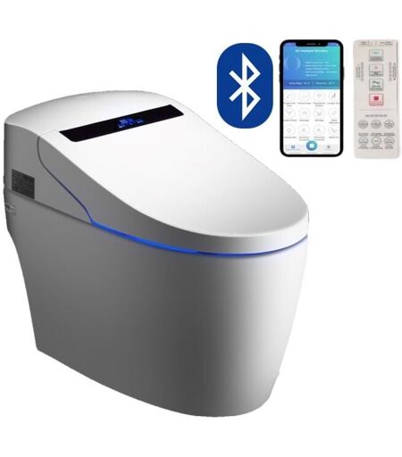 Description générale Le WC japonais lavant monobloc Platinium 2 offre une expérience de toilette moderne et hygiénique. Grâce à sa conception innovante, il permet de réaliser des économies d'eau et de papier toilette tout en garantissant un confort optimal. Ce modèle élégant s'intègre facilement dans vos toilettes et nécessite une arrivée d'eau ainsi qu'une prise électrique à proximité pour son installation. Spécifications techniques Type : WC monobloc Chasse d'eau : réservoir intégré de 5,5 litres Evacuation : horizontale adaptable en verticale Dimensions : L 74,5 cm x l 41 cm x H 55 cm Poids net : 53 kg Couleur : blanc Certification : CE et RoHS Garantie : 2 ans Compatibilité et accessoires Commande via smartphone par Bluetooth Télécommande à radiofréquence incluse Nécessaire de fixation au sol fourni Installation Installation facile et rapide Une arrivée d'eau et une prise électrique requises à proximité Utilisation Double fonction de lavage avant et arrière Écran LCD bleu ...
