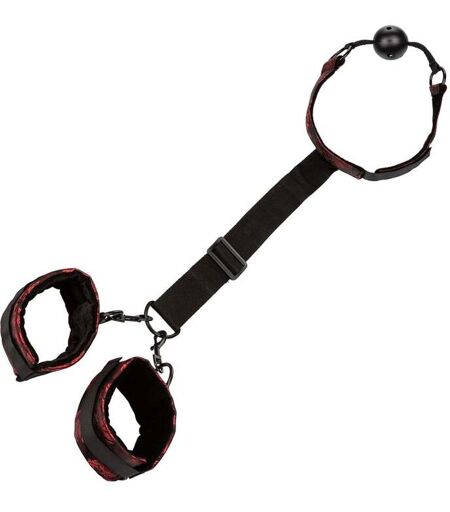 Profitez d'une expérience BDSM stimulante et intense grâce aux Menottes & Bâillon Boule Scandal de CalExotics. Prenez le contrôle sur votre moitié avec ces menottes reliées à un bâillon boule qui lieront les poignets de votre partenaire tout en l'empêchant de parler... Le design pivotant de cet accessoire BDSM vous permet une utilisation pratique, avec un maximum de flexibilité. Réalisez vos fantasmes les plus fous en multipliant les positions dans le plus grand des conforts, tout en jouissant de l'excitation procurée par les jeux de domination et de soumission ! Les menottes et le bâillon sont totalement ajustables, pour s'adapter à chacun et chacune et vous garantir encore plus de confort. La boule du bâillon est doté de trous permettant de respirer correctement, même en position de totale soumission... Faites-vous plaisir en toute sécurité grâce aux Menottes & Bâillon Boule Scandal ! L'intérieur doux et pelucheux des menottes et du bâillon vous procurera un contact agréable avec votre peau, tandis que l'extérieur imprimé en brocart de style baroque en fait un accessoire particulièrement élégant qui ravira les amaterus de tissus raffinés. Le rouge et le noir apportent une touche glamour, pour du plaisir avec style ! Les menottes et le bâillon étant détachables, vous pourrez également les utiliser de manière indépendante, pour varier les plaisirs. Les attaches mousquetons et anneaux universels pourront très bien s'adapter à d'autres types d'accessoires ou de supports ! Osez sortir de votre zone de confort en ravivant la flamme dans votre couple... Dimensions : * Circonférence du bâillon : 66 cm * Circonférence des menottes : 35,5 cm Vos Menottes & Bâillon Boule Scandal de CalExotics sont fabriquées en polyéthylène et polyester, sans phtalates pour respecter votre corps. ...