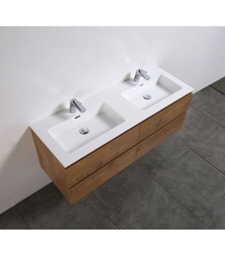 Meuble de salle de bain Alice 1380 couleur chêne L'ensemble est de très grande qualité et bénéficie d'une excellente finition. La surface en en bois MFC mélaminé du meuble sous vasque convient bien entendu aux pièces humides. Ceci apporte longévité et un nettoyage simplifié. Les tiroirs sont aménagés de charnières en métal de qualité supérieure et d'un système de fermeture automatique et facile dit Soft-Close, les côtés en métal sont extrêmement résistants. Le corps en gris foncé est de haute qualité. Les tiroirs à ouverture complète peuvent supporter un poids allant jusqu'à 40 kg. Des ouvertures pour le passage du siphon sont incorporées au tiroir du haut. Le meuble sous vasque est livré prémonté, prêt á être fixé sur le mur de votre salle de bain. Vous avez la possibilité de commander la double vasque en fonte minérale avec une surface brillante ou mate. La fonte minérale de nos produits est de qualité supérieure. La surface est lisse et non poreuse et de ce fait facile à nettoyer ...