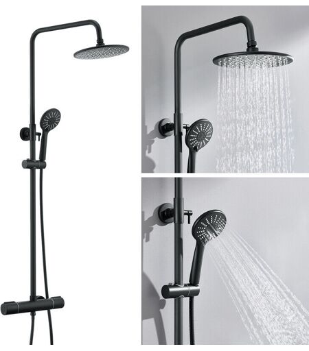 Auralum Colonne Douche Thermostatique Noir avec Mitigeur Thermostatique de 38°C,Colonne Douche Réglable Hauteur 840-1210mm,Tête Douche/Pommeau à Main 3 Jets ♥DESCRIPTION DU PRODUIT →ACIER INOXYDABLE ET ABS DE HAUTE QUALITÉ : le robinet thermostatique et la colonne de douche de cette colonne de douche noire sont en acier inoxydable, la pomme de douche est en ABS (résistant à la rouille) avec un traitement de placage à l'eau de surface du produit. →38°C THERMOSTAT : Le colonne de douche est thermostaté à 38°C pour éviter les brûlures aux personnes âgées et aux enfants. Après avoir réglé la température de l'eau, la vanne thermostatique verrouille la température et il n'est pas nécessaire de régler la température de l'eau la prochaine fois que vous l'utiliserez. →HAUTEUR RÉGLABLE : La longueur de La barre de douche en acier inoxydable du colonne de douche thermostatique peut être réglée en hauteur et la plage est de 840 à 1210 mm. La hauteur d'installation standard de la douche à jet ...
