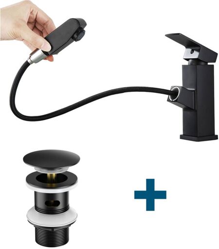 Auralum - Robinet Mitigeur Lavabo avec Douchette Extractible,Noir, Hauteur 187mm+Bonde Lavabo Bonde Pop-up avec Trop-plein Automatique Universelle