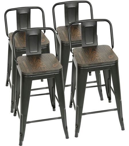 YONGQING Lot de 4 Tabouret de Bar en métal Noir Mat Style Industriel avec Dossier et Assise en Bois foncé Hauteur 63.5cm