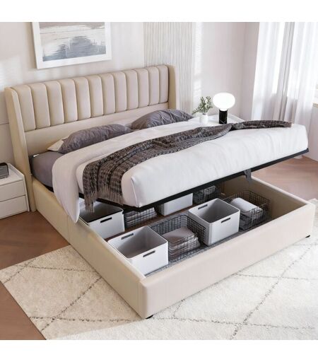 PERGAR Lit coffre 160x200, lit adulte, sommier à lattes, style moderne, tête de lit design, tissu en lin, beige