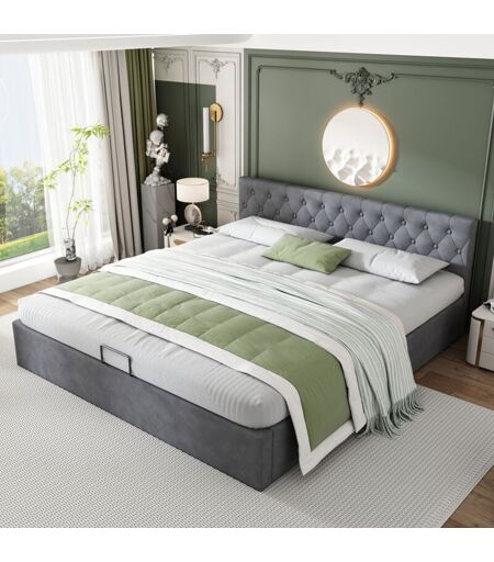 Keepbuying - Lit coffre en tissu Velours,Rangements,Sommier à lattes en bois, Lit double,180x200cm,Gris