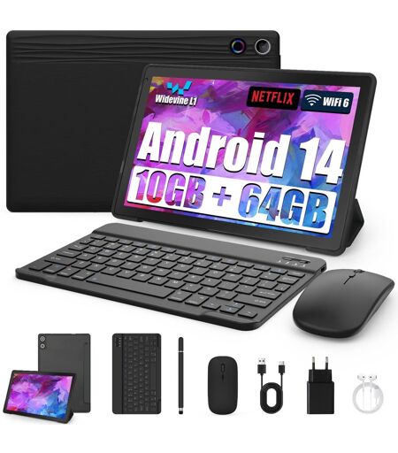 Octa-Core puissant et grande mémoire : Profitez de cette tablette Android avec des performances supérieures du processeur octa-core de 2,0 GHz. La RAM de 10 Go (3 Go d'origine + 7 Go étendus) offre d'excellentes fonctions multitâches, extensible avec une carte micro SD jusqu'à 1 To (non incluse) pour un stockage facile des photos quotidiennes, des films, etc. De plus, le Play Store est préinstallé pour que vous puissiez télécharger toutes vos applications préférées. Dernier Android 14 et connexion WiFi 6 rapide : la dernière interface utilisateur d'Android 14 se concentre davantage sur l'optimisation du système et de la protection des données et offre une gamme d'options de configuration personnalisées pour répondre aux différentes exigences de protection des données. La tablette de 10 pouces est compatible avec les bandes 2,4 GHz et 5 GHz, a une capacité plus élevée et une latence plus faible, et offre une vitesse de connexion réseau plus stable. Dans le même temps, cette tablette Android 14 prend également en charge le déverrouillage par reconnaissance faciale, l'accès rapide à la tablette et le partage de vos mains. Grand écran de 10 pouces et support Widevine L1 : cet écran de protection des yeux est conçu pour une visualisation immersive, avec une haute résolution de 1280 x 800, un contrôle de la lumière bleue clair et lumineux qui rend le réglage naturel de la luminosité plus confortable. Profitez de vidéos haute résolution avec ces applications de plateforme populaires, notamment Netflix, YouTube, Amazon à tout moment avec Widevine L1. Prime Video et Disney + Les deux grands haut-parleurs et le système de son surround vous offrent une expérience d'expérience audiovisuelle impressionnante. Travailler et se détendre sont possibles : étui fin de 13 mm avec un poids de seulement 650 grammes. Grâce à sa forme compacte et légère, la tablette peut être facilement rangée dans un sac à dos. Profitez-en lors d'activités de plein air ou de courts voyages. Cette tablette multifonctionnelle peut se connecter à divers appareils Bluetooth pour le transfert de données et également aider ceux qui doivent faire face à des problèmes de travail à temps en déplacement. Ce kit tablette PC comprend une tablette, un clavier Bluetooth et une souris Bluetooth, des écouteurs, un stylet capacitif, un étui de protection pliable, un câble Type-C et un chargeur. Vous pouvez facilement les échanger. Avec une caméra frontale de 5 mégapixels et une caméra arrière de 8 mégapixels, vous pouvez facilement passer des appels vidéo. Remarque : la souris nécessite l'installation de piles et n'est pas incluse dans le kit. ...
