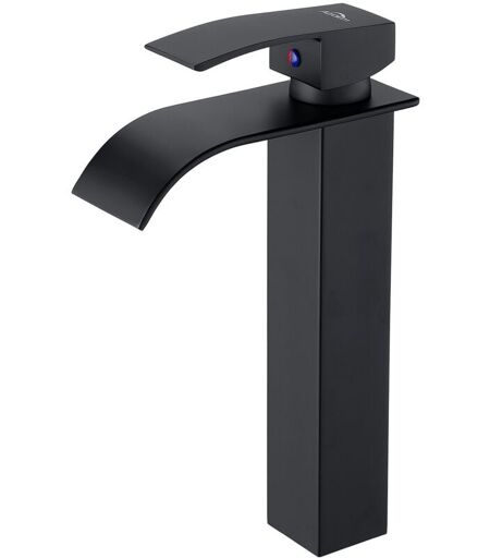 Auralum - Robinet Lavabo Cascade Noir, Haut Mitigeur Vasque à Poser Salle de Bain, Robinetterie Grand Bec Carré en Laiton, Eau Chaude et Froide