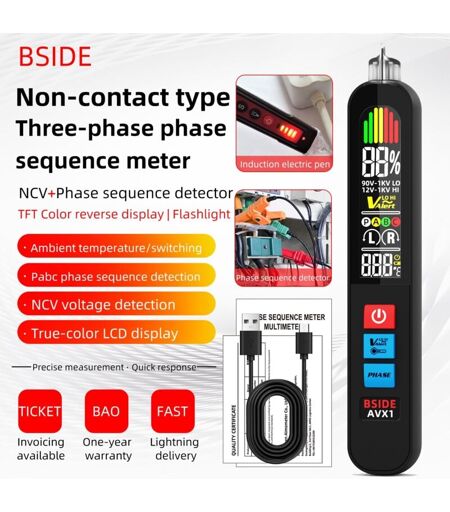 Durficst - Testeur de phase 2 en 1 bside AVX1 et détecteur ncv, contrôle de séquence de phase de ligne sous tension écran couleur lcd haute