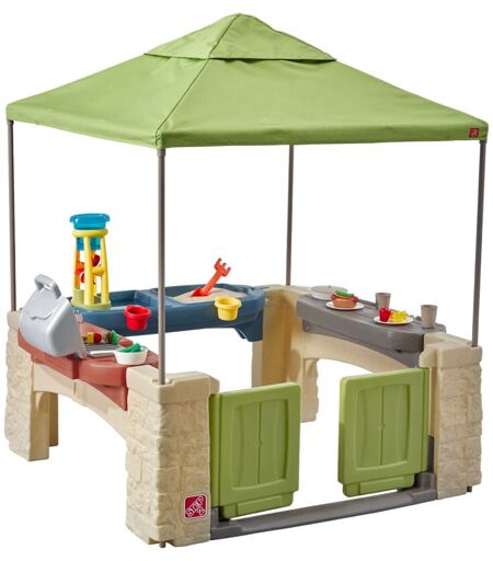 STEP 2 Step2 All Around Speelpatio Maison Enfant Patio en plastique pour enfants avec cuisine et accessoires Comprend table de jeu sable et eau