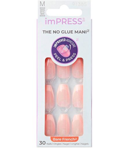 Envie d'une nouvelle French Manucure autocollante ? Dis "oui" aux imPRESS Press-On Nails. Grâce à la nouvelle "technologie PureFit", ces ongles autocollants ont une longue durée de vie et tiennent en toute sécurité jusqu'à 7 jours. Il suffit de les décoller, d'appuyer et c'est tout ! Ongles French Press-On discrets avec pointes blanches et forme moyenne légèrement conique, La manucure autocollante immédiate qui ménage tes ongles naturels, La manucure la plus simple - il suffit de décoller, d'appuyer et de commencer, Nouvelle colle améliorée pour une bonne tenue jusqu'à 7 jours, Le set d'ongles contient 30 ongles Press-On parfaitement manucurés, un tampon de préparation, une mini-lime à ongles et un crayon de manucure. Choisir la taille : Avant la pose : Tiens les ongles avec les petits onglets en direction de tes cuticules. Choisis la taille appropriée pour chaque ongle (1 est la plus grande, 11 la plus petite). Si tu es entre deux tailles, opte pour la plus petite. Préparation : lave soigneusement tes mains avec du savon et de l'eau, puis sèche-les bien. Repousse délicatement les cuticules à l'aide du pousse-cuticules fourni. Nettoie ensuite soigneusement tes ongles avec le tampon de nettoyage fourni afin de garantir une adhérence optimale. (Comme alternative ou en complément, tu peux aussi utiliser de l'alcool). Pose des nails : retire la couche de protection des nails. Appuie ensuite le nail au milieu et des deux côtés en même temps sur ton véritable ongle et maintiens-le pendant 30 secondes. (Pose les ongles du pouce en dernier). Laisse tes mains sécher pendant au moins une heure et évite de limer les ongles jusqu'à ce qu'ils adhèrent complètement. Avertissement : bien se laver le visage, les mains et la peau exposée après utilisation. Porter des gants de protection/des vêtements de protection/un équipement de protection des yeux/du visage. Éviter de respirer les poussières/fumées/gaz/brouillards/vapeurs/aérosols. Utiliser uniquement à l'extérieur ou dans des locaux bien ventilés. Porter un équipement de protection des yeux/du visage. Tenir à l'écart de la chaleur/des étincelles/des flammes nues/des surfaces chaudes. Ne pas fumer. Maintenir le récipient hermétiquement fermé. Mettre à la terre le récipient et l'installation à remplir. Utiliser du matériel électrique/de ventilation/d'éclairage/d'équipement antidéflagrant. Utiliser uniquement des outils ne produisant pas d'étincelles. Prendre des mesures de précaution contre les charges électrostatiques. EN CAS DE CONTACT AVEC LES YEUX : Rincer délicatement à l'eau pendant plusieurs minutes. Enlever si possible les lentilles de contact éventuellement présentes. Continuer à rincer. Si l'irritation oculaire persiste : demander un avis médical/une aide médicale. EN CAS DE CONTACT AVEC LA PEAU (ou les cheveux) : Retirer immédiatement tous les vêtements contaminés. Laver la peau à l'eau/se doucher. EN CAS D'INHALATION : Transporter la victime à l'air frais et lui permettre de respirer librement. En... ...