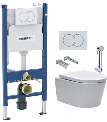 Pack Bati-support Geberit 112cm + Cuvette Swiss Aqua Technologies sans bride + Douchette bidet + Plaque blanche