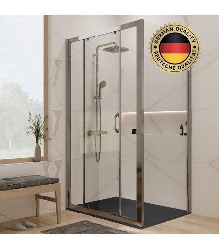 La porte de douche Huppe Next est équipée de la technologie Hüppe Anti-Plaque , pour un verre particulièrement facile à nettoyer. Les dépôts calcaires et les salissures sont ainsi considérablement réduits. Fourni avec un siphon horizontal, le receveur de douche en marbre coulé se caractérise par sa hauteur peu élevée et des avantages suivantes : Surface très agréable Entretien hygiénique facile Propriétés d'isolation thermique Résistance mécanique Caractéristiques du Pack douche Porte coulissante 120cm + Receveur Satalek 120x80cm, Noir (Huppe2-12090BL) : HÜPPE Next - Porte de douche 120 cm en verre transparent avec porte coulissante + Profilés chromés mat (140402.069.322) HÜPPE Next - Paroi de douche latérale seule 90cm en verre transparent + Profilés chromés brillants (140505.069.322) Swiss Aqua Technologies B-Way Receveur de douche rectangulaire 120x90cm avec siphon, en marbre coulé, Noir (SATALEK12090) Siko Multi siphon pour receveur de douche . HÜPPE Next - Porte de douche 120 cm ...