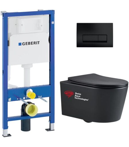 Pack wc Bati-support Geberit wc Swiss Aqua Technologies sans bride + Abattant softclose + Plaque noire mat
