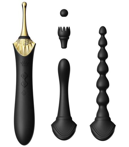 Inspirée de l’histoire et des mystères de l’Égypte antique, la gamme Legend de la marque ZALO (https://www.espaceplaisir.fr/marques/364-zalo) retranscrit subtilement l’élégance et le raffinement de cette époque mythique et vous invite à la poursuite du désir et à l’exploration sans retenue... Je suis le Stimulateur Clitoridien Chauffant Bess 2. Je stimule, je fais vibrer et je chauffe vos zones érogènes pour vous donner du plaisir et des orgasmes. Partez à la recherche de mes différentes facettes, je suis polyvalent ! Votre clitoris, vos tétons, votre point G et votre anus n'ont aucun de secret pour moi... 4 embouts interchangeables, 5 possibilités d'utilisation et 8 modes de vibration : voilà comment me définir au mieux. Je propage de très puissantes vibrations là où vous en avez envie. En effet, ma technologie innovante DirectPower permet à mon moteur de vibrer jusqu'à 10 000 fois par minute ! Voilà comment vous pouvez m'utiliser : * Stimulateur Clitoridien, avec mon embout en forme de petite boule. * Stimulateur de Tétons, avec mon embout en forme de fleur. * Vibromasseur Point G, avec mon embout long et courbé. * Chapelet Anal, avec mon embout long et doté de 6 perles stimulantes de tailles progressives. * Vibromasseur, en me retournant et en insérant le manche dans votre vagin ! Mes 4 différents embouts vous permettent une stimulation ultra-précise pour du plaisir ciblé. Mes 8 modes de vibration vous permettent de varier le rythme et l'intensité. Et surtout, ma fonction chauffante vous apporte encore plus de sensations ! Waterproof, vous pouvez donc m'utiliser sous la douche ou dans votre bain. Mais aussi me nettoyer très facilement. Fabriqué en silicone hypoallergénique et plastique ABS de qualité médicale, je suis doux au toucher et sain pour votre corps. Rechargeable à l'aide de mon câble USB magnétique pour vous faire profiter de 3 heures de plaisir consécutives. Dimensions : * Longueur totale : 21,9 cm * Diamètre max. insérable (vibromasseur) : 3,3 cm * Diamètre embout boule : 1,2 cm * Longueur embout fleur : 3,4 cm * Longueur embout point G : 12,5 cm * Diamètre insérable embout point G : 1,9 cm * Longueur embout perles anales : 17,5 cm * Diamètre min. embout perles anales : 1,2 cm * Diamètre max. embout perles anales : 2 cm Découvrez aussi mon ancienne version non chauffante et sans perles anales, le Stimulateur Clitoridien Bess (https://www.espaceplaisir.fr/plaisir-100-clitoris/18343-zalo-bess-clitoral-vibrator.html) ! Pour que votre plaisir soit complet, espaceplaisir vous recommande d'utiliser un lubrifiant à base d'eau. Il est important de nettoyer votre sextoy avant et après chaque utilisation. ...