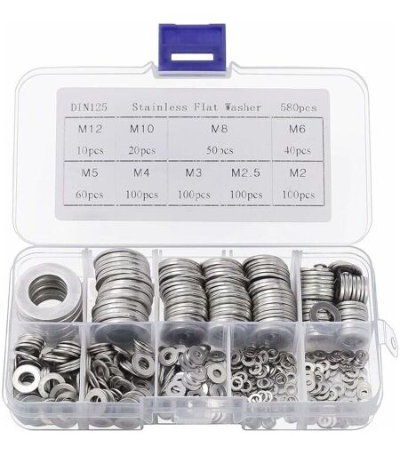 Aimoonsa - Rondelle Inox avec Bote de Rangement (Lot de 580) - Assortiment de 9 Tailles M2, M2.5, M3, M4, M5, M6, M8, M10 & M12 - Lot de Rondelles