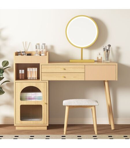[Miroir haute définition] La coiffeuse est équipée d’un miroir haute définition doté d’une gradation LED tricolore. Ce miroir réglable peut être déplacé pour répondre à vos différents besoins, offrant un éclairage parfait. [Matériau de première qualité] L’ensemble de coiffeuse est fabriqué en aggloméré E1 de haute qualité, ce qui garantit une stabilité et une durabilité élevées. Il est également résistant aux taches et aux rayures et est facile à nettoyer. Les portes de l’armoire latérale sont en verre arc-en-ciel transparent et vous offrent une surface de présentation claire. [Grand espace de rangement] Organisez tous vos articles de beauté sans encombrement pour rendre votre routine beauté quotidienne plus facile et plus rapide. [Cette coiffeuse offre trois tiroirs spacieux, avec un meuble latéral et un plateau de table, pour un rangement efficace de vos cosmétiques, parfums et bijoux. [Assemblage facile] La coiffeuse est livrée avec des instructions de montage faciles à suivre. ...