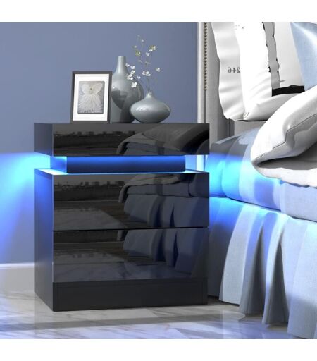 KEEPBUYING Table de chevet Haute Brillance avec LED Lumières,Armoire Commode 2 Tiroirs Table de Nuit Meuble de chambre - 45x35x52cm,Noir