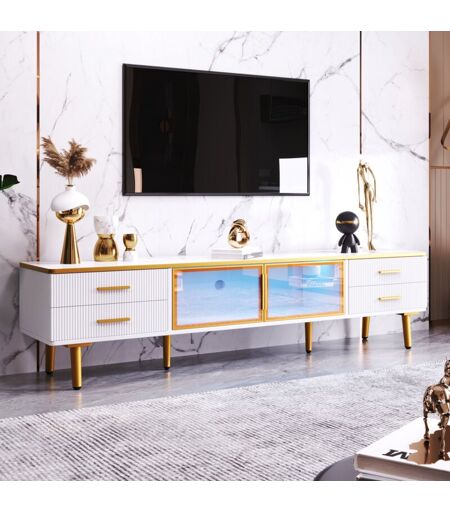 Keepbuying - Meuble tv Moderne en Marbre,4 Pieds,Tiroirs Poignées Dorées,Portes en Verre Trempé Marron,Meuble tv Bas pr Salon,170x37x47.5cm