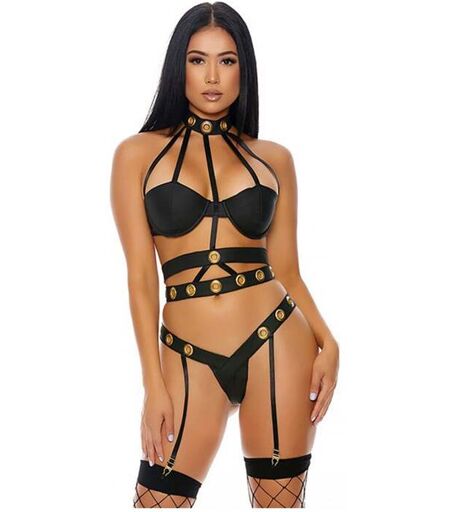 Découvrez l'Ensemble 2 Pièces Seductive Cage Noir de la marque Forplay, un body très sexy qui vous rendra totalement irrésistible ! Une tenue sexy avec laquelle vous serez esclave de l'amour ! Cet ensemble 2 pièces possède un design unique mêlant lanières et œillets dorés pour sublimer votre corps. Il se compose d'un soutien-gorge bustier et un string jarretelles. Le soutien-gorge bustier est doté de bonnets en balconnet opaques à armatures qui galbera vos seins à souhait. Ses fines lanières viennent orner le dessus de votre décolleté pour se rejoindre en tour de cou. De gros œillets dorés habillent votre cou, votre taille et vos hanches entre les fines brides noires et les empiècements opaques. Sa forme bustier se prolonge jusqu'au milieu de votre ventre pour un style de cage hyperprovoquant. Le string très échancré et taille haute épouse vos hanches et mettra parfaitement en valeur la courbe de vos fesses. Les jarretelles réglables reliées au string se placent le long de vos cuisses et vous permettront d'associer vos bas préférés. Cette tenue très sexy est un véritable appel à la tentation et sera la promesse de soirées très chaudes ! Composition : 90% Polyester, 10% Spandex Tailles S, M, L, XL. ...