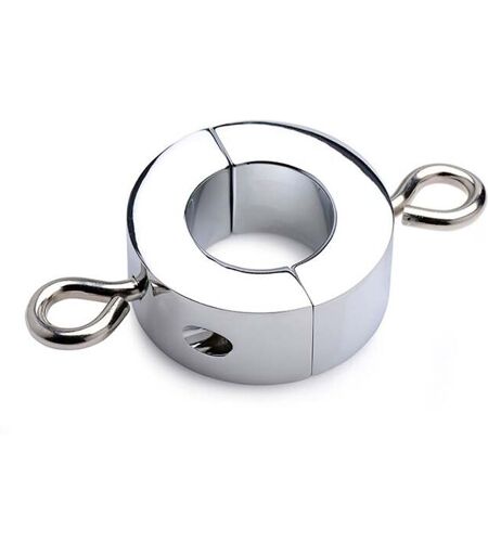 Vous et vos testicules adorez être stimulés ? Peut-être même que, secrètement ou non, vous êtes excité·e à l'idée de les presser, les serrer, les tirer... Ou que vous fantasmez à l'idée d'infliger ce genre de punition érotique à votre partenaire, s'il en a aussi envie. L'Anneau en Métal Ball Stretcher de la marque Master Series (https://www.espaceplaisir.fr/marques/273-master-series) pourrait bien être le jouet sexuel qui vous permettra de réaliser tous vos fantasmes... Plus qu'un cockring rigide pour les testicules, cet objet de plaisir est l'allié de vos jeux BDSM plus ou moins intenses ! Fixez-le autour de vos testicules ou de ceux de votre partenaire, et laissez-vous aller aux sensations uniques qui s'offrent à vous. Son poids de 220 grammes vous fera goûter au plaisir ultime de la souffrance érotique consentie. L'Anneau en Métal Ball Stretcher se fixe à l'aide de vis. Ainsi, il ne s'enlève pas facilement pour encore plus d'excitation lors de vos jeux de soumission et de domination. Son métal lourd et résistant en fait un véritable équipement BDSM, prêt à accompagner vos séances de plaisir teinté de douleur pendant de longues années... Cet accessoire BDSM dispose de deux petits anneaux d'attache auxquels vous pouvez accrocher une chaîne ou une laisse pour des scénarios de contrainte érotique très excitants, ou encore des poids pour satisfaire les envies de sensations encore plus intenses ou douloureuses. Composition : métal, alliage aluminium Dimensions : * Diamètre externe : 6 cm * Diamètre interne : 3,3 cm * Épaisseur : 2,5 cm *Boules lestées non incluses. ...