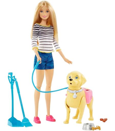 Cet adorable chiot a conquis le coeur de Barbie. C'est si amusant d'aider Barbie à promener son petit compagnon et à lui apprendre la propreté. Surprise! Tourne la molette sur le côté du chiot et tire sur sa laisse: il avance tout seul! Aide Barbie à faire de même, grâce à la laisse qui tient toute seule dans sa main. Lorsque le chiot doit faire ses besoins, appuie sur sa queue. Barbie peut nettoyer les excréments à l'aide du balai et de la pelle. Récompense ce chiot obéissant en lui offrant à manger dans son écuelle et un os qui tient dans sa gueule. Pour promener son chiot au parc, Barbie a choisi une tenue confortable avec un haut rayé, un short en jean et des baskets roses. Les amis des animaux adoreront balader cet adorable chiot et imaginer toutes les histoires qui unissent Barbie à son petit animal. Inclut une poupée Barbie avec tenue et accessoires, un chiot (et sa laisse) qui marche et fait ses besoins, un balai et une pelle, des crottes en plastique, une écuelle et un os. La poupée ne peut pas tenir debout ou marcher toute seule. Les couleurs et les décorations peuvent varier. Ce chiot unique avance tout seul et fait ses besoins comme un vrai chien! Pour le faire marcher, tourne la molette sur le côté du chiot et tire sur sa laisse: il avance tout seul! Lorsque le chiot doit faire ses besoins, appuie sur sa queue. Barbie peut nettoyer les excréments à l'aide du balai et de la pelle. Récompense ce chiot obéissant en lui offrant à manger dans son écuelle et un os qui tient dans sa gueule. Barbie porte un haut rayé noir et blanc, un short en jean et des baskets roses. Les amis des animaux adoreront balader ce chiot à croquer et imaginer toutes les histoires qui unissent Barbie à son petit animal. Qualités et caractéristiques environnementales Incorporation de matière recyclée : emballage comportant au moins 1% de matières recyclées en moyenne. Recyclabilité : emballage entièrement recyclable en séparant les éléments, imprimé(s) papier(s) entièrement recyclable(s). Attention : Ne convient pas aux enfants de moins de 36 mois. ...