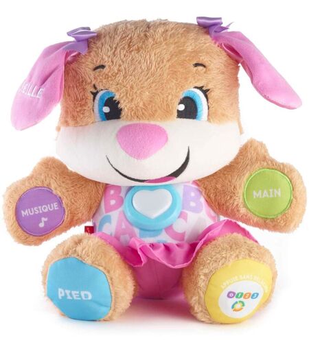 Découvrez la première meilleure amie de bébé ! La peluche Sis Éveil Progressif Rires et Éveil est si douce et si câline ! Avec elle, apprendre est tellement amusant ! Cette peluche musicale réagit au toucher de bébé par des chansons, des phrases et des sons entraînants afin de lui faire découvrir plus de 100 mots en rapport avec les parties du corps humain, les couleurs, les formes et plus encore ! Et parce que chaque bébé grandit à son propre rythme, la technologie Éveil Progressif de Sis vous permet de choisir le niveau d'éveil le plus adapté à votre enfant. Vous avez le choix entre trois niveaux d'apprentissage comprenant des chansons, des expressions et des sons adaptés aux différentes étapes du développement. Le coeur multicolore de Sis s'illumine et clignote au son de la musique ! Plus de 75 sons, chansons, mélodies et phrases ! La main, le pied, l'oreille et le coeur lumineux de Sis réagissent au toucher de bébé (5 points d'activation en tout !) Apprend à bébé 100 de ces premiers mots et l'initie aux parties du corps humain, à l'alphabet, aux couleurs, au calcul et plus encore ! 3 niveaux d'Éveil Progressif pour évoluer avec votre enfant Aide à développer les sens de bébé ainsi que sa motricité fine Qualités et caractéristiques environnementales Recyclabilité : emballage majoritairement recyclable en séparant les éléments, imprimé(s) papier(s) entièrement recyclable(s), pile(s) et/ou accumulateur(s) majoritairement recyclable(s). Présence de métaux précieux : contient au moins 2 milligrammes de métaux précieux. Présence de terres rares : contient au moins 6483 milligrammes de terres rares. ...