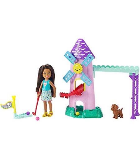 Chelsea doll and her puppy are the dream team, ready to score a hole-in-one This playset comes with a double-story windmill golf course and other accessories, including a golf club and balls. Steps lead up to the teeing ground where little hands can help Chelsea doll aim and putt the ball across the sky-blue bridge, under the rainbow arch, and into the pink brick tower. The ball really rolls Guide it through the towers spinning windmill fan, down the wrap-around slide, and straight into the winning hole. Chelsea doll is ready to play in her casual outfit and shoes. ...