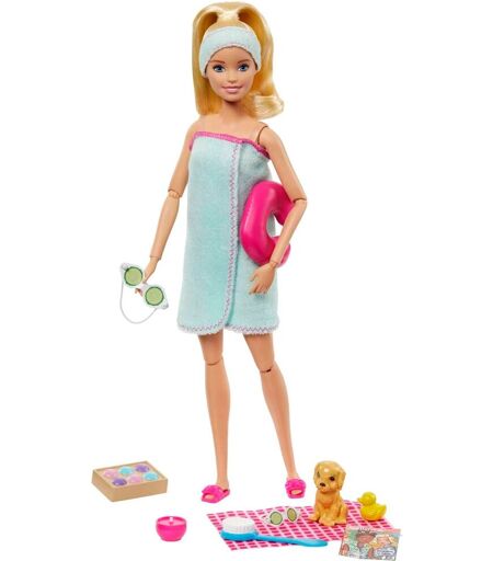 Barbie sait combien il est important de prendre soin de soi ! Cette poupée avec accessoires sur le thème du spa a tout le nécessaire pour passer la journée à se faire chouchouter. Ce coffret avec poupée et figurine chiot plantera le décor pour inventer des histoires au spa. Barbie porte une tenue chic et confortable et dispose de nombreux éléments de jeu pour stimuler l'imagination des enfants. Certains accessoires disposent d'une poignée pour tenir dans la main de Barbie, d'autres s'adaptent au chiot, comme le petit masque pour les yeux imitant les rondelles de concombre. Les enfants vont adorer les poupées Barbie sur le thème du bien-être qui vont enrichir encore davantage leur monde imaginaire. Collectionnez-les toutes pour permettre à votre enfant de découvrir de nouvelles possibilités, car avec Barbie, il peut être tout ce qu'il veut (Tous vendus séparément. Certains produits peuvent ne pas être commercialisés). Les enfants vont découvrir le plaisir de prendre soin d'eux en vivant une journée au spa avec Barbie grâce à ce coffret comprenant une poupée, un chiot et 9 accessoires à thème ! Barbie pourra se détendre au spa et utiliser des accessoires de bain tels qu'un canard en caoutchouc, un magazine, une brosse de bain, une serviette, un coffret de boules de bain et une bougie. Le chiot n'est pas en reste : il a lui aussi son masque pour les yeux et peut profiter du coussin de nuque. Certains éléments de jeu disposent de poignées pour plus de réalisme. Barbie porte une robe en éponge à la fois chic et confortable, une serviette sur la tête assortie et des chaussons de spa roses. Elle a aussi 11 points d'articulation au niveau du cou, des épaules, des coudes, des poignets, des hanches et des genoux, pour des poses et des mouvements réalistes. Les enfants vont adorer inventer des histoires avec cette Barbie spécial spa et prendre soin d'elle, car avec Barbie, ils imaginent tout ce qu'ils peuvent devenir plus tard ! Collectionnez les autres poupées Barbie sur le thème du bien-être pour créer un univers de jeu encore plus riche et stimuler l'imagination des enfants de 3 à 7 ans ! Contenu de la boîte Inclut une poupée Barbie avec habillage et accessoires, un chiot, un canard de bain, un magazine, une brosse de bain, une serviette, un coffret de boules de bain, une bougie, un coussin de nuque et deux masques " rondelles de concombre " de tailles différentes. La poupée ne tient pas debout toute seule. Les couleurs et les décorations peuvent varier. Qualités et caractéristiques environnementales Recyclabilité : emballage entièrement recyclable en séparant les éléments. Attention : Ne convient pas aux enfants de moins de 36 mois. ...
