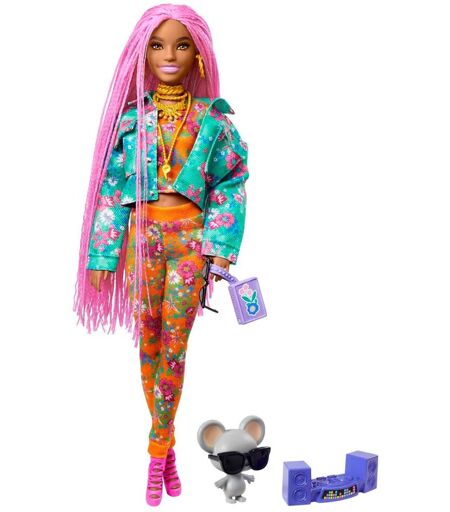 Les poupées Barbie Extra affichent un look audacieux aux couleurs vives et l'assument à 100 % ! Chaque poupée Barbie arbore un style unique, ludique et excentrique. Et que dire de leurs animaux de compagnie : uniques en leur genre, adorables et charismatiques ! Les poupées articulées Barbie Extra permettent aux enfants d'exprimer leur imagination avec style idéal pour les amateurs de mode et de stylisme. L'essentiel avec ces poupées, c'est de s'amuser avec la mode en mêlant paillettes, oursons en gélatine, emojis et coiffures extravagantes pour leur offrir un style EXTRA-ordinaire, où qu'elles aillent. Articles vendus séparément. Certains produits peuvent ne pas être commercialisés. Les poupées ne tiennent pas debout toutes seules. Les couleurs et les décorations peuvent varier. En matière de mode, les poupées Barbie Extra affichent une attitude " toujours plus ", avec 15 éléments comprenant des vêtements et des accessoires de mode, ainsi qu'un animal de compagnie avec ses propres accessoires. Cette poupée Barbie Extra arbore de très longues tresses roses. Elle porte un ensemble de survêtements orange à imprimé floral surmonté d'une veste turquoise à imprimé floral, pour un look espiègle totalement assumé. Les accessoires de la poupée Barbie incluent une pochette à imprimé floral, des chaussures roses à lanières, des lunettes de soleil et de nombreux bijoux dorés à superposer de quoi stimuler la créativité et l'imagination des enfants. La figurine souris incluse ne manque pas non plus de personnalité, avec sa platine de DJ et ses lunettes de soleil ! Les poupées Barbie Extra sont un cadeau idéal pour les enfants de 3 à 10 ans, en particulier s'ils aiment se démarquer ! Contenu de la boîte Inclut 1 poupée Barbie Extra avec 15 habillages et accessoires, et un animal de compagnie. Qualités et caractéristiques environnementales Incorporation de matière recyclée : emballage comportant au moins 4% de matières recyclées en moyenne. Recyclabilité : emballage entièrement recyclable en séparant les éléments. Attention : Ne convient pas aux enfants de moins de 36 mois. ...