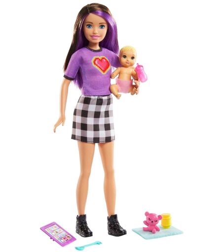 Les enfants peuvent jouer aux baby-sitters avec les coffrets Barbie Skipper Baby-Sitter qui comprennent une poupée Skipper, une poupée bébé et des accessoires pour recréer des moments pleins de tendresse. La poupée Skipper baby-sitter dispose de 4 accessoires pour s'occuper de l'adorable bébé. Certains sont équipés d'une poignée qui tient dans la main de la poupée pour des histoires plus réalistes. Les enfants peuvent collectionner l'ensemble des poupées et accessoires de la gamme Baby-Sitter pour jouer toute la journée à s'occuper d'un bébé. Contient une poupée portant une tenue et des accessoires, ainsi que des éléments sur le thème du baby-sitting. Tous vendus séparément. Certains produits peuvent ne pas être commercialisés. Les poupées ne tiennent pas debout toutes seules. Les couleurs et les décorations peuvent varier. Les enfants peuvent imaginer des histoires de baby-sitting avec ce coffret Barbie Skipper Baby-Sitter comprenant 1 poupée baby-sitter, 1 poupée bébé et 4 accessoires thématiques ! La poupée Skipper baby-sitter dispose d'une liste de choses à faire, d'un biberon, d'un petit pot et d'une cuillère pour remplir sa mission. La poupée bébé porte une couche en tissu et à scratchs (comme les vraies), facile à enlever et à remettre ! La poupée Skipper porte un t-shirt violet orné d'un coeur, une jupe à carreaux noirs et blancs et des bottines noires. Avec ces adorables coffrets, les enfants vont adorer jouer aux baby-sitters et inventer toutes sortes d'histoires avec Skipper et ses amis. Un superbe cadeau pour les jeunes frères et soeurs, et tous ceux qui aiment prendre soin des petits. Les enfants peuvent collectionner d'autres poupées et jouets de baby-sitting Barbie pour encore plus de possibilités de jeu et d'histoires à inventer. (Tous vendus séparément. Certains produits peuvent ne pas être commercialisés.) Qualités et caractéristiques environnementales Incorporation de matière recyclée : emballage comportant au moins 3% de matières recyclées en moyenne. Recyclabilité : emballage entièrement recyclable en séparant les éléments. Attention : Ne convient pas aux enfants de moins de 36 mois. ...