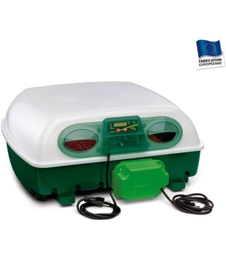 Couveuse automatique River System Egg Tech 49 oeufs Vous cherchez une couveuse fiable, performante et simple d'utilisation ? Cette couveuse automatique est particulièrement indiquée pour votre petit élevage ! Ce modèle est muni de deux hublots d'inspection, d'un affichage de température digital, de deux bacs à eau pour réguler l'hygrométrie en fonction des différentes phases de développement de l'?uf Il dispose également d'un panier d'incubation universel permettant de faire incuber des ?ufs de tailles variables, en passant des ?ufs de caille aux ?ufs d'oie. L'homogénéité de la température est garantie par un ventilateur. Ce modèle de couveuse dispose d'un moteur pour effectuer le retournement des ?ufs automatiquement. Caractéristiques du produit : - Dimensions : 58 x 50 x 26 cm ; - Puissance : 230V-150W ; - Chauffage par résistance souple ; - Température régulée par un thermostat de précision (1/10°C) ; - Hygrométrie assurée par deux bacs à eau ; - Grille de support d'éclosion fournie ; - Capacité : 49 ?ufs de moyenne ou grande taille (poule, oie, cane), 196 ?ufs de caille. Fabrication Italienne Garantie 2 ans ...