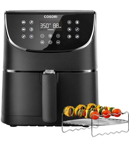 Panier XXL Son panier XXL de 5,5L est parfait pour une famille de 1 à 5 personnes. Sa puissance jusqu'à 1700W lui permet cuisson des aliments rapide et plus économe en énergie. ; ; Cuisson à 360° La technologie de circulation d'air à 360° réduit la graisse des frites jusqu'à 95% par rapport à une friteuse classique. ; 11 programmes L'affichage à LED de la friteuse sans huile Cosori CP158 comprend 11 programmes : steak, poulet, fruits de mer, crevettes, bacon, alimenté congelés, frites, légumes, légumes-racines, desserts, pain. ; Fonction préchauffage La fonction de préchauffage rend votre nourriture plus savoureuse, et maintient les aliments au chaud pour les garder à la température idéale jusqu'à 30 min. ; Nettoyage facile Panier amovible et antiadhésif sans BPA ni PFOA et qui passe au lave-vaisselle. Un bouton de séparation permet de sortir facilement le panier. ; Manipulation en toute sécurité Une poignée à toucher froid et le design à impulsions évitent le risque de brûlure. Protection contre la surchauffe et fonctions d'arrêt automatique pour assurer la sécurité de la cuisson. ; Recettes gourmandes Livre de cuisine en français qui contient 100 recettes originales, délicieuses et faciles à préparer. ; Inclus Edition spéciale avec grille métallique à brochette et 5 piques. ; La friteuse sans huile Cosori CP158 Chef Edition a remporté le prix allemand du design red dot en 2019. ; Capacité de frites fraîches : 1.5 - Cuisson : avec une cuillère d'huile ou sans huile 1.700 W - Thermostat réglable : jusqu'à 200°C Cuve amovible - Filtration de l'huile : nettoyage facile 1 bac et 1 panier ...