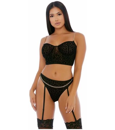 À la fois chic et sensuelle, découvrez une collection sexy, branchée et de renommée mondiale pleine de style et d’attrait !  Découvrez l'irrésistible Ensemble 2 Pièces Chain Me Up Bustier Noir de la marque Forplay ! Un ensemble mêlant maille fine transparente noire habillée de motifs léopard qui mettra outrageusement votre corps en valeur pour vous rendre aussi sexy que provocante. Un soutien-gorge semi-corset doté d'armatures ornées de bretelles en chaînes dorées réglables pour rehausser votre poitrine tout habillée de léopard ultra sexy. A l'arrière les attaches en agrafes ajoutent une touche de glamour. Son string échancré taille haute léopard orné d'une chaîne dorée au niveau de la taille dévoilera sensuellement vos fesses. Ses jarretelles réglables permettront d'accorder vos bas préférés et ajouter une touche très féline en plus à votre tenue !   Composition: 95% Polyester, 5% Elasthanne Tailles S, M, L, XL ...
