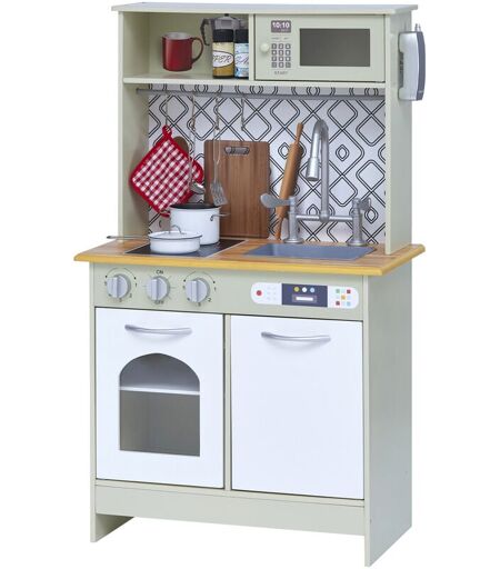 L'ingrédient parfait pour le jeu de rôle de votre petit chef en herbe, la cuisine en bois Teamson Little Chef Boston maison de ferme moderne est la cuisine idéale pour les petits esprits et mains curieux ! Débordant de couleurs, de fonctionnalités interactives et de neuf accessoires, cette cuisine de jeu de ferme moderne présente des finitions vert olive clair et blanc avec un dosseret à motifs et des accents argentés, ce qui la rend idéale pour les garçons et les filles. La conception fonctionnelle et interactive comprend trois portes ouvertes/fermées, trois boutons de four rotatifs et cliquables, deux brûleurs à induction imprimés, un évier avec robinet, une étagère de rangement et quatre crochets de suspension pour améliorer le temps de jeu de votre tout-petit. Avec 9 accessoires inclus - un pot en plastique avec couvercle, une casserole, une spatule, une louche, des bouteilles de salière et poivrière, un gant de cuisine et un téléphone - cette cuisine pour enfant encourage les ...