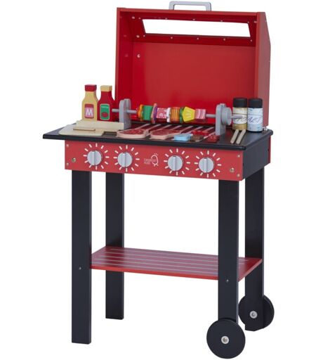 L'ensemble de jeu de barbecue pour enfants d'arrière-cour Teamson Kids 'Little Helper' aidera votre tout-petit à préparer une tempête lorsqu'il s'agira de jeux interactifs amusants ! Ce faux gril présente une finition rouge vif et noire avec des accents argentés, ce qui le rend idéal pour les garçons et les filles, et peut être utilisé à l'intérieur ou à l'extérieur. La conception fonctionnelle et interactive comprend un couvercle supérieur ouvert/fermé, quatre cadrans rotatifs et cliquables, une essoreuse à kebab rotative et deux roues rotatives pour améliorer le temps de jeu de votre tout-petit, car l'ensemble de jeu BBQ Grill peut être facilement déplacé d'une aire de jeu à une autre. . Avec 25 accessoires inclus - une planche à découper, un couteau, des pinces, des brochettes, des salières et poivrières, des bouteilles de ketchup et de moutarde et 17 morceaux de faux aliments - ce barbecue en bois pour enfants encourage les jeux de rôle et illumine l'imagination et la créativité ...