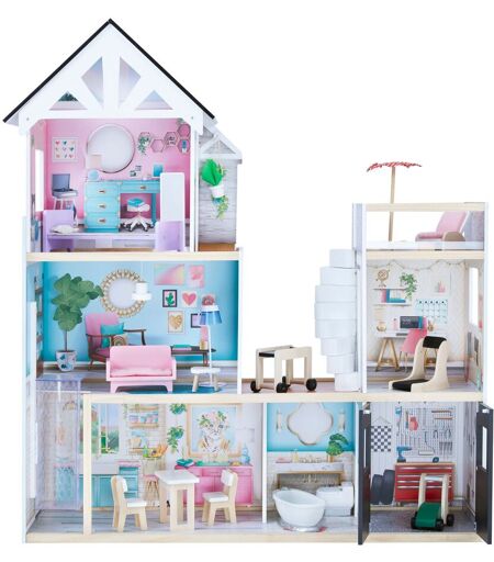 Laissez libre cours à l'imagination de votre enfant avec le manoir en bois Olivia's Little World Dreamland. Cette maison de jeu de style mezzanine sur trois étages est entièrement interactive, parfaite pour les jeux de rôle et offre 18 accessoires pour que votre enfant puisse explorer divers scénarios dans chaque pièce. La maison de poupée en bois comprend un escalier en colimaçon, un toit en pente, une terrasse aux murs clairs, un garage et même un ascenseur. Tous les meubles de la maison de poupées en bois peuvent être déplacés d'une pièce à l'autre et la lampe suspendue et les toilettes fonctionnent à piles, ce qui permet d'obtenir des effets d'éclairage et de sons lors de la chasse d'eau. Les 18 accessoires comprennent : un lit avec un oreiller attaché, un miroir sur pied, une suspension, un canapé, une table basse, un lampadaire, une table à manger avec 2 chaises, des plantes, un parasol, une chaise longue avec repose-pieds, un barbecue, un tapis roulant, des toilettes en plastique avec effet sonore , baignoire, tondeuse à gazon -Les toilettes nécessitent une pile LR44 x 3 pièces (incluse) -Panneau arrière interchangeable dans la salle d'activités du 2e étage (à droite) ...
