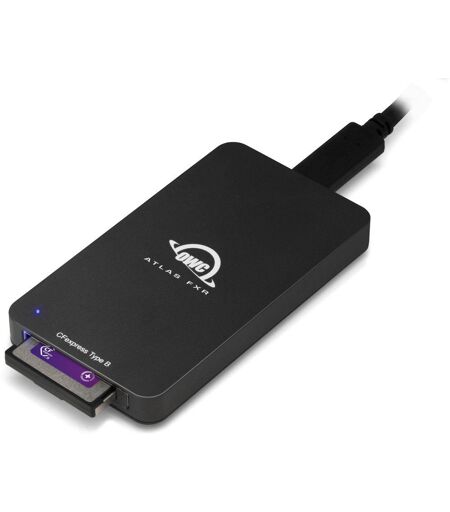 OWC Atlas FXR. Cartes mémoire compatibles: CFexpress, Couleur du produit: Noir, Taux de transfert de données: 40000 Mbit/s. Interface: Thunderbolt 3/USB 3.2 Gen 2 (3.1 Gen 2). Largeur: 50 mm, Profondeur: 90 mm, Hauteur: 13 mm. Quantité: 1 pièce(s). Câbles inclus: Thunderbolt, Adaptateurs d'interface inclus: USB Type-C - USB Type A ...