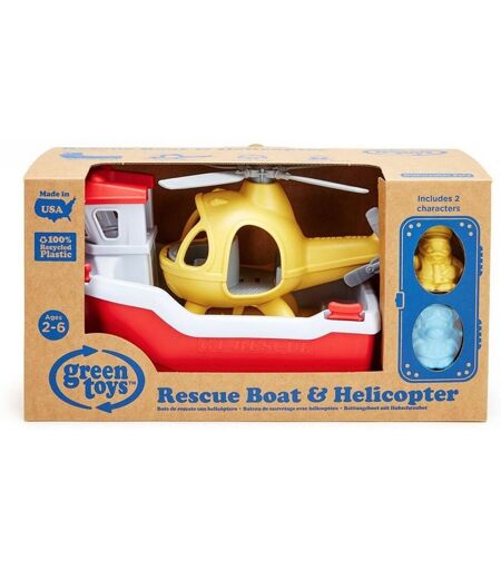 Bateau d'intervention avec hélicoptère de secours et deux figurines, le tout en plastique recyclé Greentoys. Un ensemble de jeu écologique, ludique, trés résistant et multi fonction qui offrira aux plus jeunes des heures de jeu et manipulation.. Dès 2 ans ...